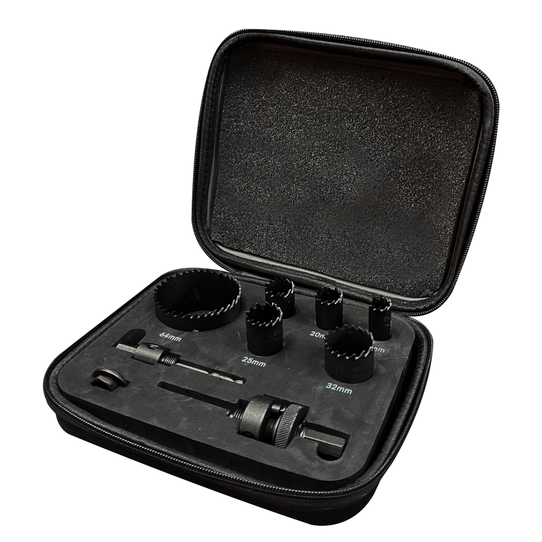 1 x 16mm, 1 x 20mm, 1 x 22mm, 1 x 25mm, 1 x 32mm, 1 x 64mm, 1 x A1 Arbor, 1 x A2 Arbor, 1 x Arbor Adaptor, 1 x Reinforced Case, 2 x HSS Pilot Drill Bits