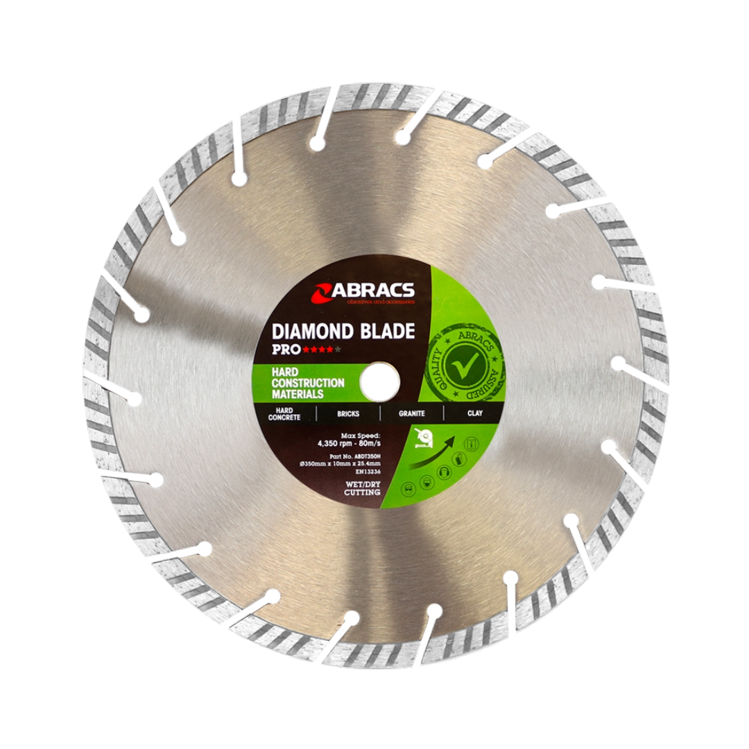 Pro-line Hard Construction Materials Blades have been expertly developed with a soft bond so they can effectively cut through very hard materials such as granite with relative ease. The 10mm angled turbo segments and narrow gullets reduce the chance of segment loss & maximise performance. Manufactured with premium quality diamonds and a