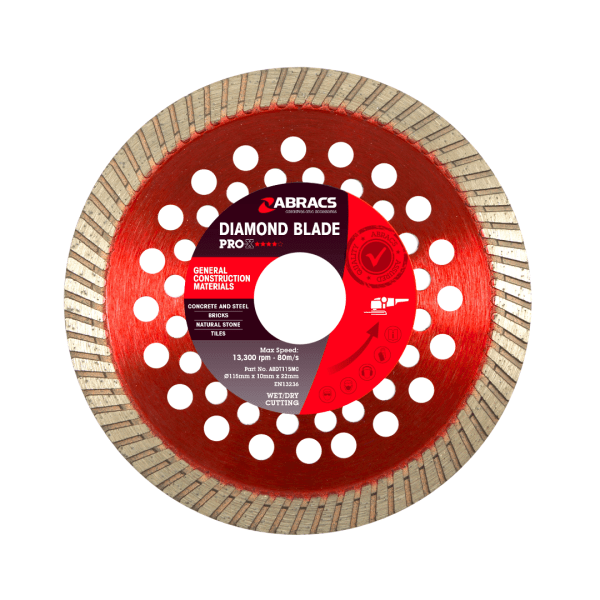 Abracs Pro-X General Construction Materials Diamond Blades are designed for maximum performance and long life. Suitable for cutting virtually all construction materials including steel and reinforced concrete. The 10mm continuous segment eliminates the chance of segment loss and cooling hole technology reduces cutting temperature and increases user visibility for enhanced safety.