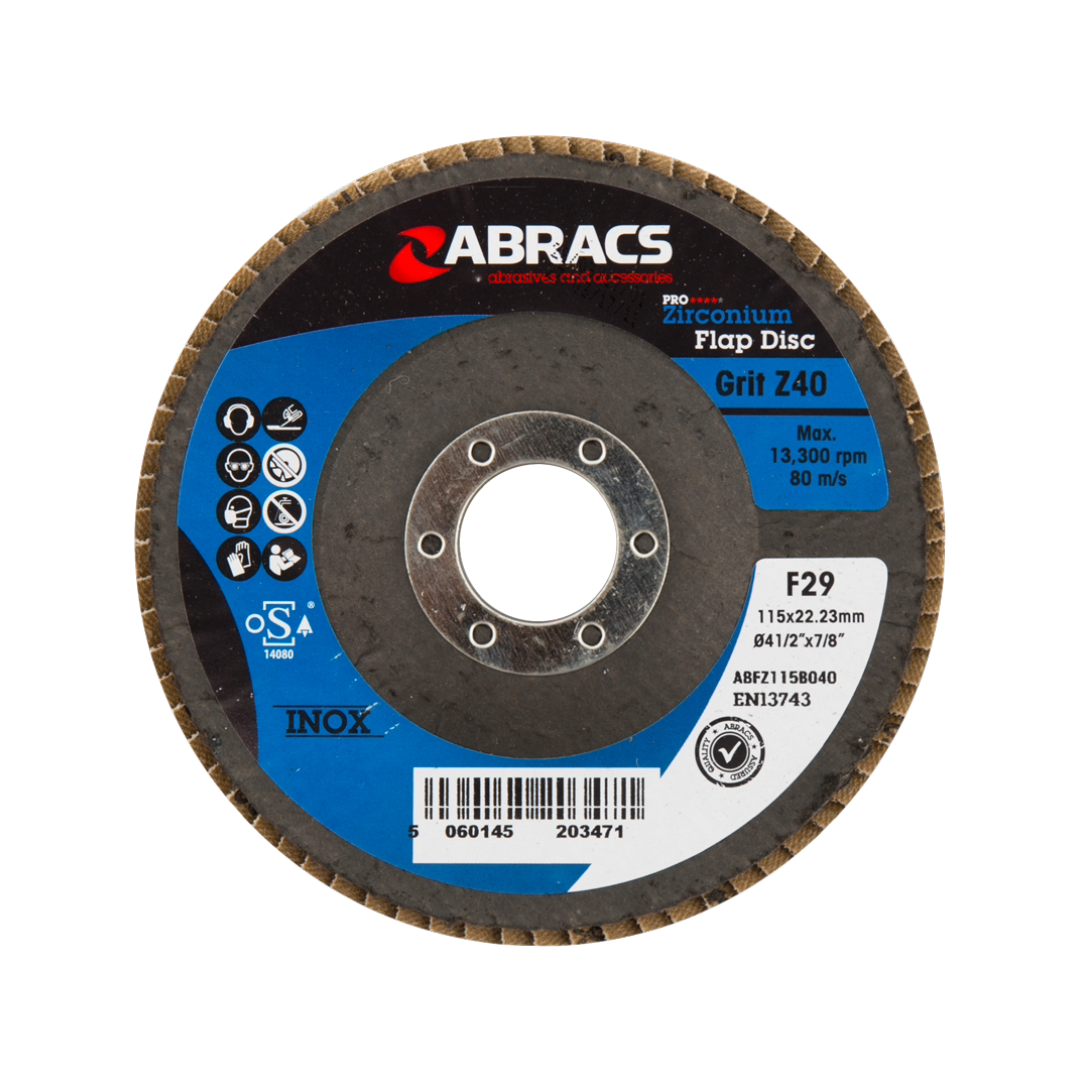 Pro-line Zirconium flap discs are long life & suitable for a full range of metal applications including stainless steel. Abracs Zirconium Flap Discs discs are manufactured to O.S.A. Safety standards