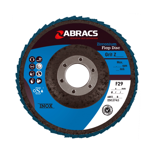 Pro-line Zirconium flap discs are long life & suitable for a full range of metal applications including stainless steel. Abracs Zirconium Flap Discs discs are manufactured to O.S.A. Safety standards