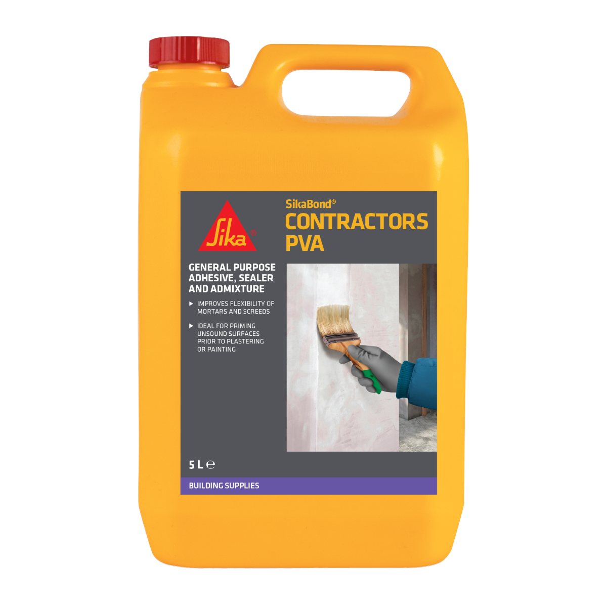 SikaBond® Contractors PVA is a multi-purpose, water-based adhesive, primer, sealer, and mortar admixture. It adheres to most common building materials, excluding PVC and rubber, and is ideal for priming unsound surfaces before plastering or painting, enhancing cement mixtures and dust sealing on flaking paintwork and walls. SikaBond® Contractors PVA is an adhesive for use on wood, cork, textiles, plaster, concrete etc.