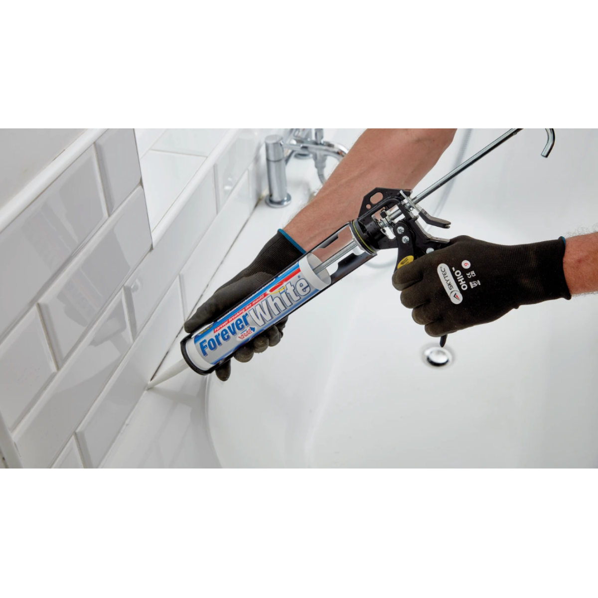 EVERBUILD FOREVER WHITE® contains Mould Shield which actively protects the sealant against the growth of bacteria, mildew and black mould that are commonly found in areas of high humidity. EVERBUILD FOREVER WHITE® is permanently waterproof and flexible and is produced from a superior silicone formula. EVERBUILD FOREVER WHITE® is tested and certified by an independent microbiological laboratory to show no mould growth after more than 10 yrs simulated ageing.
