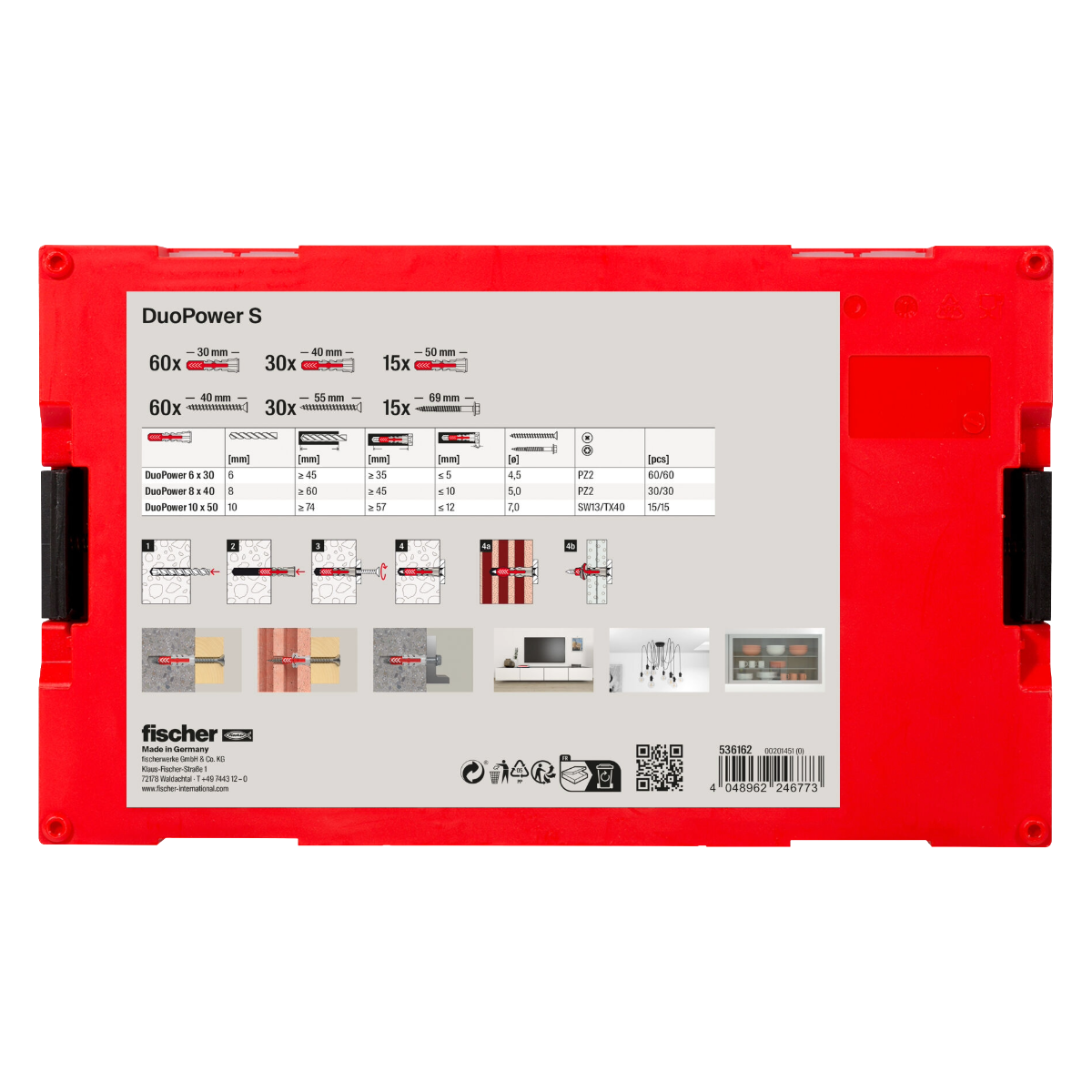 The fischer FixTainer is a practical and universally useful box with plugs, screws and hooks for the most frequent applications and building materials. The interaction of the ideally matched components always guarantees the choice of a secure fixing solution. Thanks to the transparent lid and the compartments, the contents can be viewed at a glance. This saves time and guarantees that the suitable fixing element is selected. The description of the plug function and an overview of the appropriate building materials on the bottom of the FixTainers ensures extra security for the installation. The fischer FixTainer is easy to transport thanks to the large handle. Several boxed can be connected together with the click system. The removable partitions allow a variable and needs-based division.