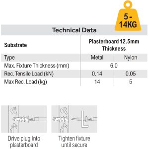 A rapid light duty plasterboard fixing for use in a wide range of applications. Cross recess head, allows simple installation with a pozi or cross drive screwdriver. Comes complete with screws.