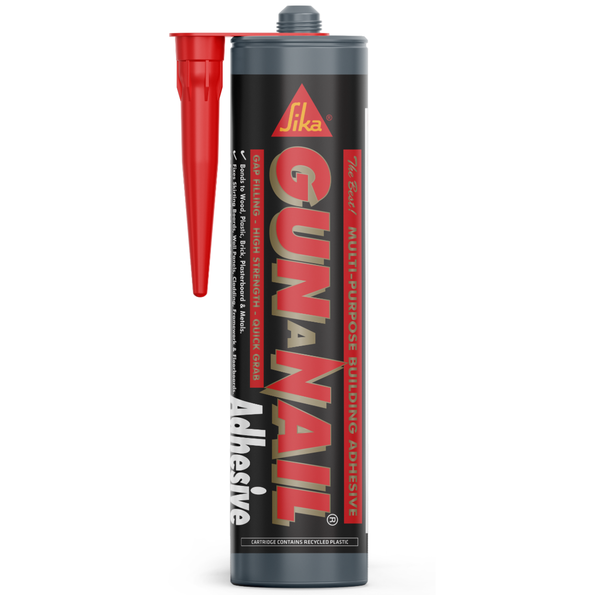 Sika® Gun a Nail is a high strength, gap filling multi-purpose building adhesive based on a solvent free system for use in a wide variety of building and home improvement applications. Sika® Gun a Nail can be used where at least one of the substrates to be bonded is porous.