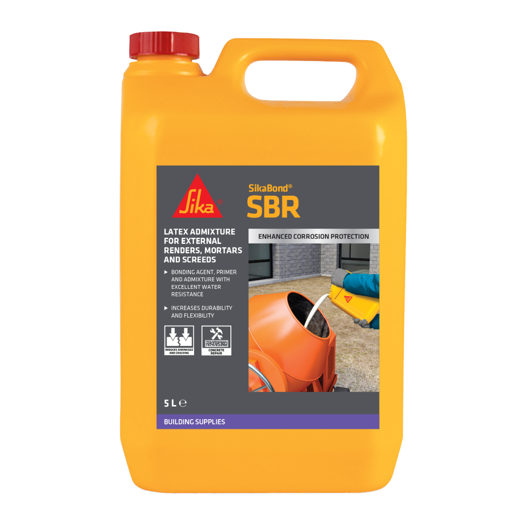 SikaBond® SBR is a styrene-butadiene co-polymer, which has numerous uses as an admixture, primer, bonding agent and sealer for use in areas subject to humidity, dampness and water contact. Improves water resistance of cement mixtures by forming a reinforcing polymer that increases long term durability and flexibility of the mix on renderings and floor screeds. An admixture for cement and concrete applications, including repair and renovation, surfacing of floors and bonding generally. It contains anti-foam to control the density of cementitious mixes.